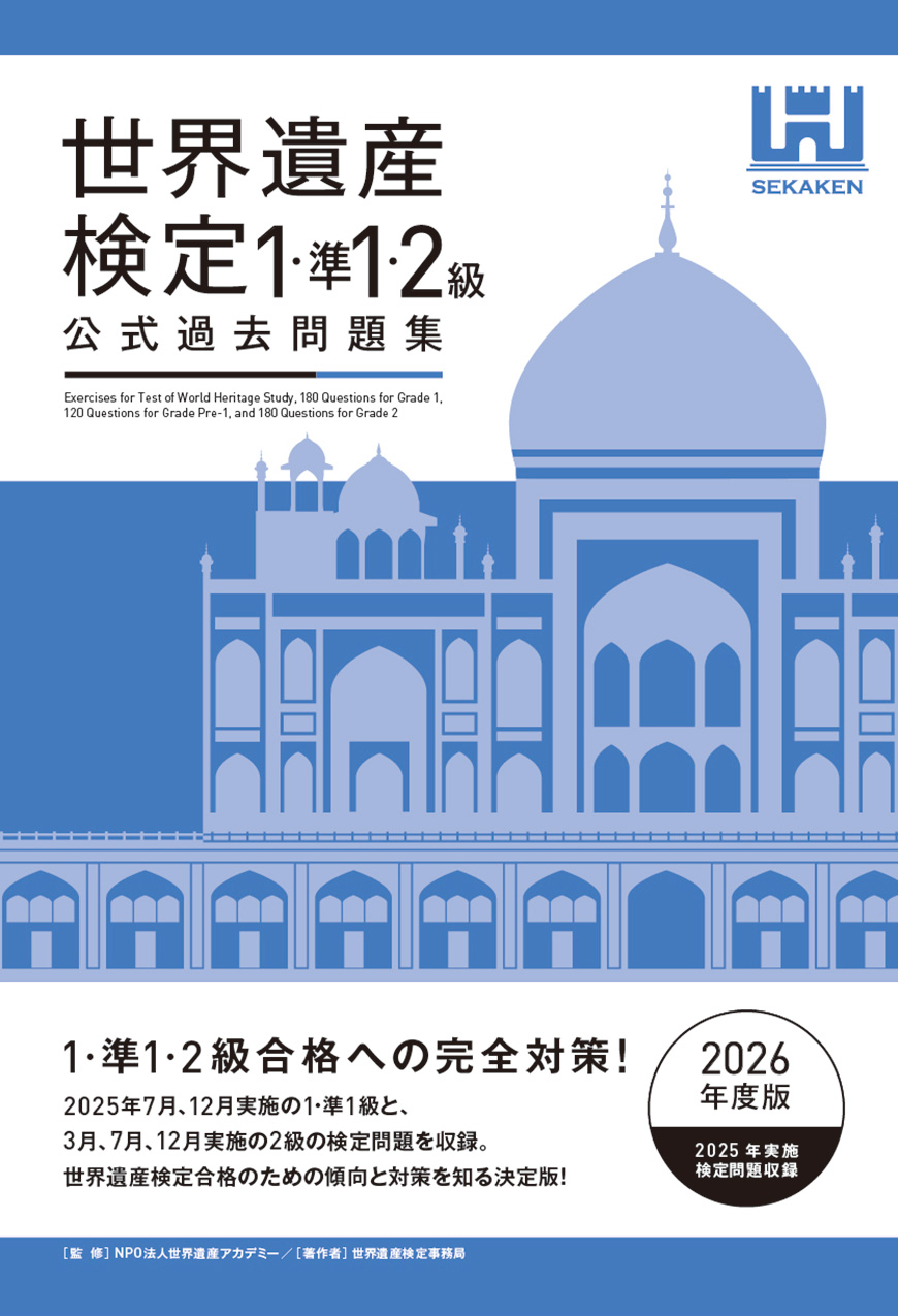 世界遺産検定公式過去問題集1・準1・2級の2026年度版です。2025年に開催された3回分(3月、7月、12月)の世界遺産検定2級の問題と解答と、2回分(7月、12月)の1級と準1級の問題と解答を収録しています。
