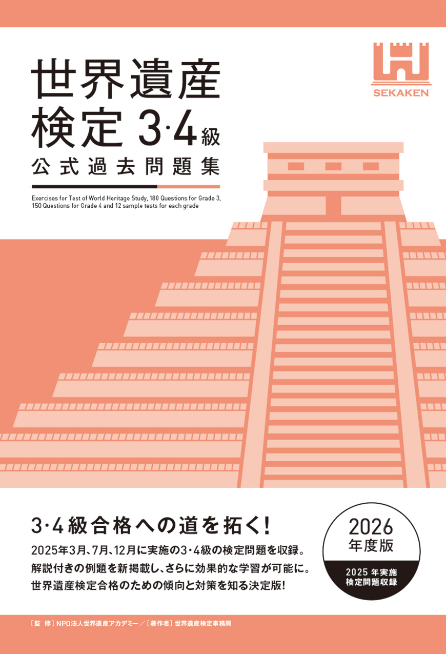 世界遺産検定公式過去問題集3・4級の2026年度版です。2025年に開催された3級と4級の3・7・12月検定問題がすべて掲載されています。巻末には例題と解説も掲載され、受検対策が強化されています。