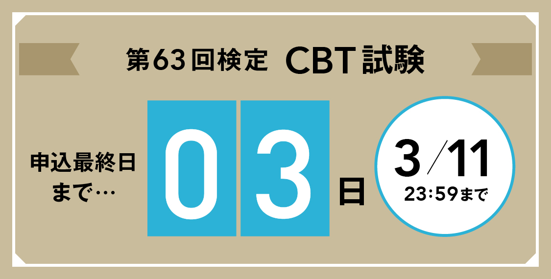 検定日 公開会場 2026年3月8日(日) CBT 2026年2月22日 (日) ~3月15日(日) 申込締切 公開会場 申込受付終了 CBT 2026年3月11日(水)23:59 お申込みはコチラ 実施級 2級 3級 4級 マイスター ・1級~ 4級 結果通知2026年4月9日(木)公開予定 日程詳細詳細を見る