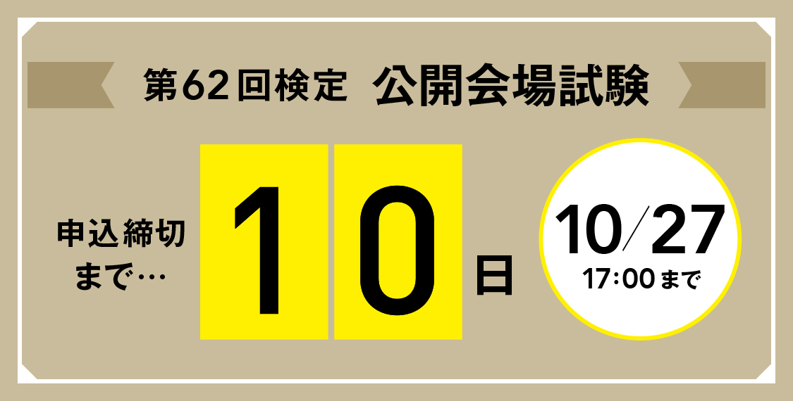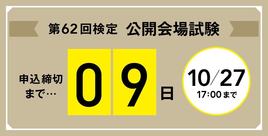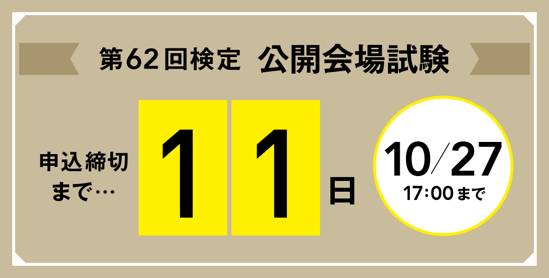 検定日 公開会場 2025年12月14日(日) CBT 2025年11月30日 (日) ~12月14日(日) 申込締切 公開会場 2025年10月27日(月)17:00 CBT 2025年12月10日(水)23:59 お申込みはコチラ 実施級 2級 3級 4級 マイスター ・1級~ 4級 結果通知2026年1月23日(金)公開予定 日程詳細詳細を見る