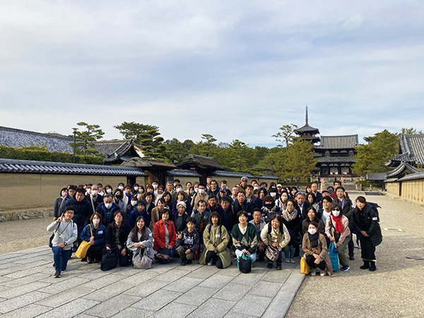 穏やかな小春日和のなか、世界遺産登録30周年を迎えた法隆寺のガイドツアーでは、参加者が現地ガイドの説明に熱心に耳を傾けていました。