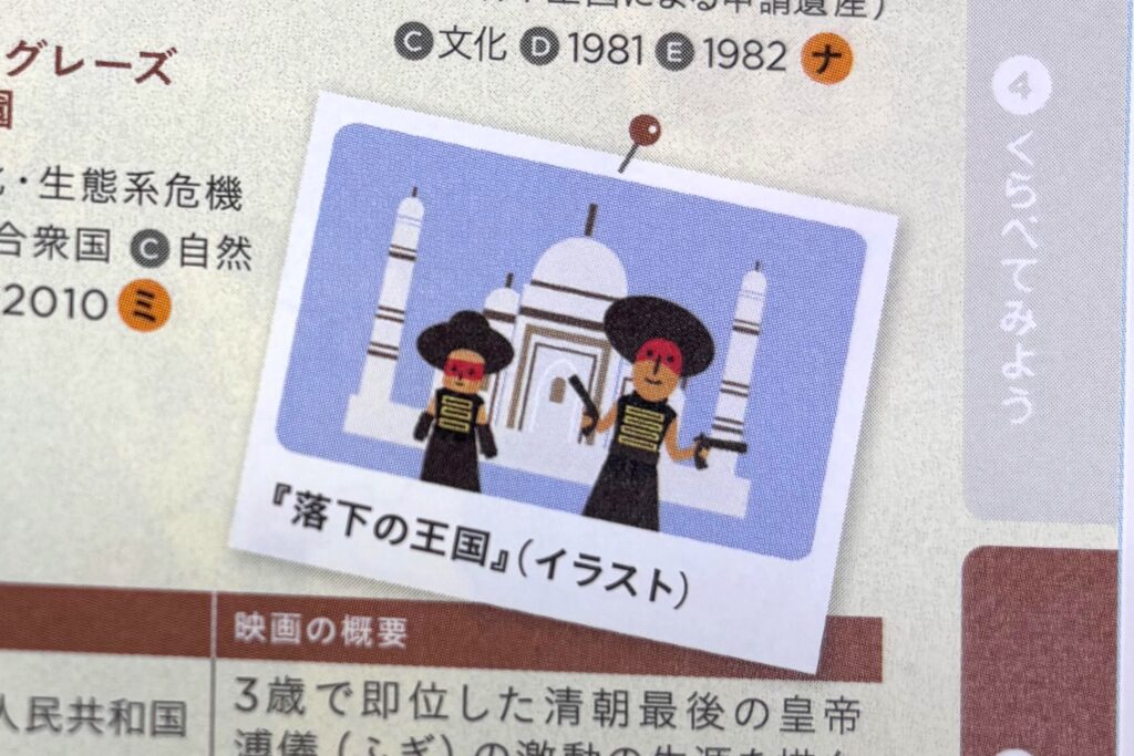 『落下の王国』は僕にとって、思い入れの深い大好きな映画です。この仕事を始めてわりとすぐの段階で、DVDの特典映像の制作に関わらせていただいただけでなく、4級テキストを初めて作った時に「世界遺産と関係する映画」で取り上げて描いてもらったイラストは、現行版の4級テキストでも引き続き使っていますし、初めて単著として書いた書籍『世界遺産のひみつ』でも映画について触れさせてもらいました。