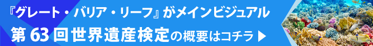 第63回世界遺産検定の申込受付が始まりました。今回のメインビジュアルは『グレート・バリア・リーフ』です。青々とした海に世界最大規模のサンゴ礁が広がる、オーストラリアを代表する自然遺産です。サンゴ以外にもジュゴンなどの絶滅危惧種が生息し、豊かな生態系が見られることでも知られます。