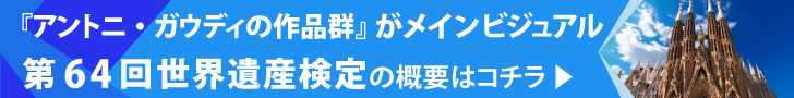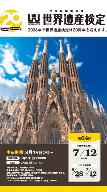 3月19日から第64回の世界遺産検定の申し込み受付けが始まりました。3月19日は聖ヨセフの日です。今回のメインビジュアルは『アントニ・ガウディの作品群』に含まれる「サグラダ・ファミリア贖罪聖堂」。奇しくもこの教会は1882年の3月19日に建設が開始されました。そこから140年以上も建設が続けられています。